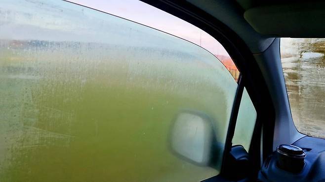 탑승자의 호흡과 젖은 신발 등에서 발생한 수증기가 폐쇄된 실내에 갇히면서 차가운 유리창 표면에 결로를 형성하기 때문입니다.