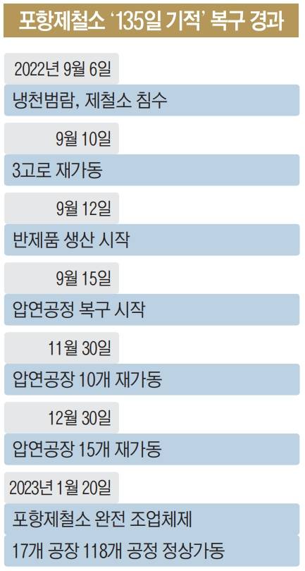 지난해 9월 6일 시간당 최대 500㎜라는 기록적인 폭우를 뿌린 태풍 힌남노로 인해 항상 뜨거운 열기로 가득했던 포항제철소가 차갑게 식었다. 인근 냉천까지 범람하는 악재가 겹친 탓에 포스코는 창사 54년 만에 쇳물 생산까지 멈춰야 했다. 여의도 면적 3배에 달하는 포항제철소의 피해로 그야말로 참담했지만 140만명이 멈추지 않고 힘을 모아 다시 ‘기적의 불’을 밝혔다.