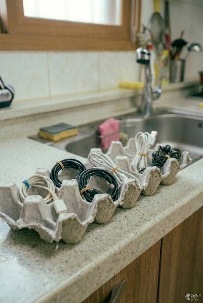 집 안에는 스마트폰 충전선, USB 케이블, 이어폰 등 각종 전선이 생각보다 많다. 이때 충전선이나 USB 케이블을 하나씩 동그랗게 말아 계란판의 각 칸에 넣어두면 서로 얽히지 않아 편하게 보관할 수 있다.