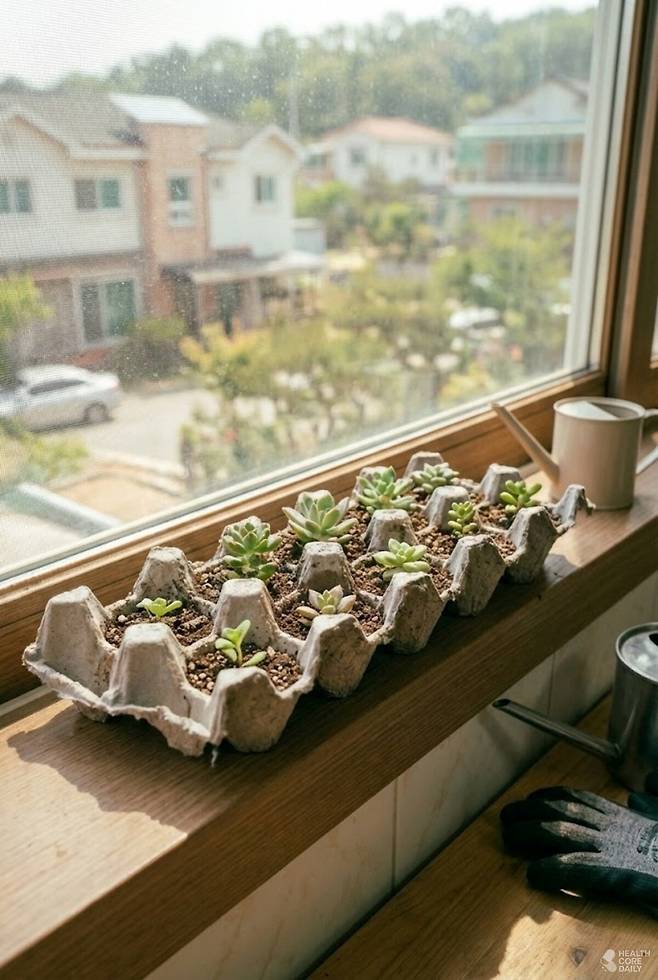 계란판은 통기성이 뛰어나 씨앗을 발아시키는 임시 화분으로 적합하다. 칸마다 흙을 70% 정도 채운 뒤 씨앗을 한두 개 올리고 흙을 얇게 덮는다. 물은 한 번에 많이 주기보다 분무기로 흙이 촉촉해질 정도만 관리하는 것이 좋다.