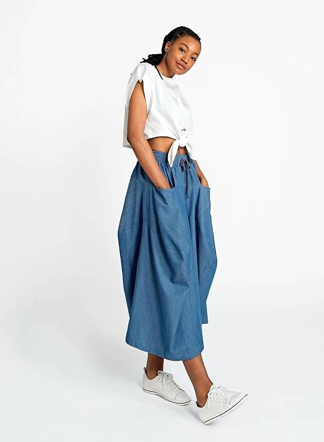 데님 소재의 스커트 팬츠는 레트로한 감성을 더해 여성스로운 매력과 평범한 일상룩에 리드미컬한 변화를 연출한다.