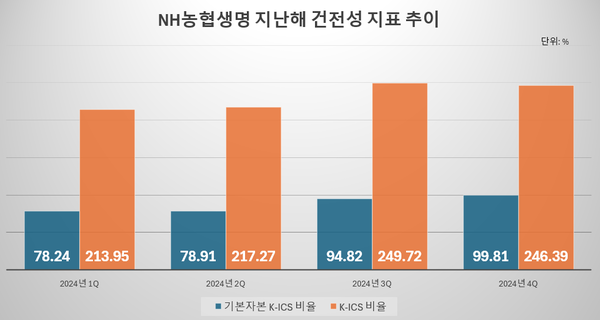 7일 농협생명에 따르면 지난해 4분기 기준 기본자본 K-ICS 비율은 99.8%로 거의 100%에 근접했다. 불과 1분기만 하더라도 78.2%에 그쳤던 것에 비하면 개선 폭이 크다. 대형보험사 중 농협생명보다 기본자본 K-ICS 비율이 높은 곳은 삼성화재(155.9%), 삼성생명(146.2%) 뿐이다. 교보생명이 97.6%로 농협생명과 비슷한 수준을 유지하고 있다.