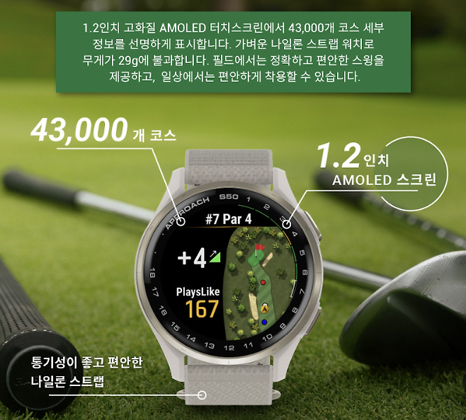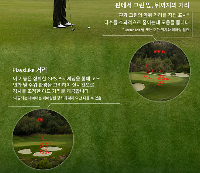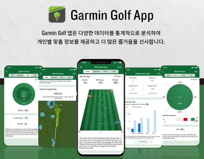 - 이 모든 기능 및 데이터를 개인 스마트폰에 가민 앱을 통하여 기록하고 핸디캡, 샷 거리, 평균 스코어 등 추가 분석할 수 있습니다.