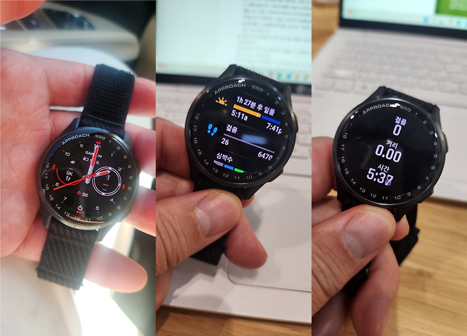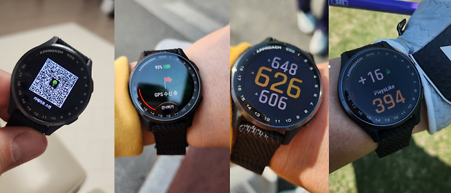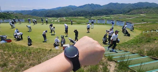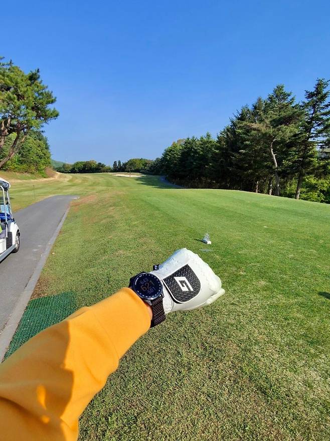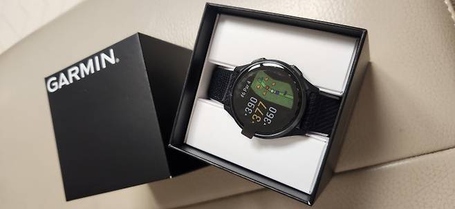 - 박스에서 꺼낸 순간부터 시계 자체는 고급스러워 보였습니다. 켜보니 QR 코드와 함께 핸드폰과 연동하자마자 다양한 연동으로 이메일, 카톡, 밴드, 당근챝, 그리고 피트니스 기능을 바로 확인할 수 있었습니다. 필드 가기 전 1주일간 사용해 보니, 손목에 가볍게 착용되어서 일상에 사용이 편했습니다.