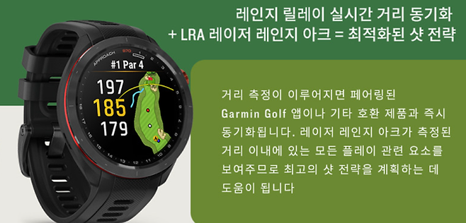 - 가민의 가장 차별된 특징은 가민 GPS 골프 워치들과 연동이 된다는 점입니다. 즉, 시계나 측정기 따로 사용 시 아쉬웠던 부분들이 사라졌다는 거지요. 예를 들어, 시계와 연결 시 핀 위치와 함께 그린의 앞과 뒤까지의 거리를 한 번에 측정해 준다는 큰 장점이 있습니다. 따라서 더욱더 정확한 공략이 가능하다는 거죠.