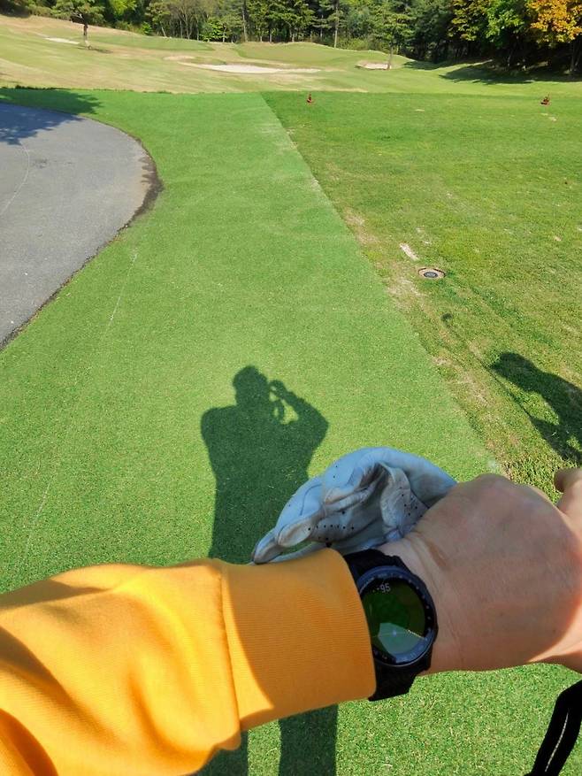 - 첫 라운드 시, 시계와 GPS 연동은 바로 잘 연결되면 와있는 골프장을 찾아서 시작. 티 박스 위치에 따라, 홀의 총거리가 표시되었고 움직일 수로 리얼타임으로 거리가 변하는 걸 보니 GPS 기능이 강력하다는 게 확인되었습니다.