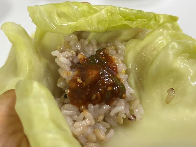 양배추쌈에 밥을 싸서 양념장을 넣고 드셔 보세요. 다른 반찬이 필요 없을 정도로 맛있습니다.