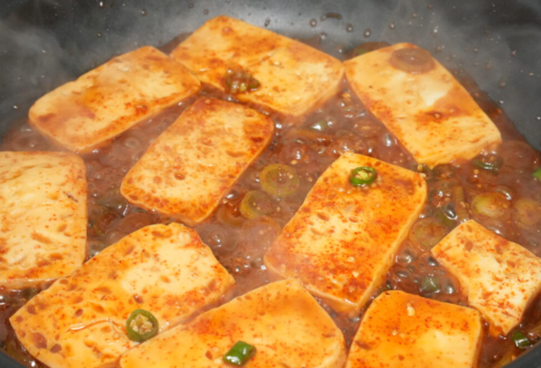 중간에 한 번씩 팬을 흔들어주거나 숟가락으로 양념을 떠서 두부 위에 뿌려주면 간이 골고루 퍼지게 된다. 뚜껑을 닫은 상태로 5분 이상 은근하게 조려주는 게 이 레시피의 핵심 포인트다.