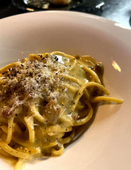 로마식 전통 방식으로 크림을 사용하지 않고, 계란과 치즈만으로 깊은 맛을 낸 요리입니다. 고소하고 풍부한 맛이 특징입니다.