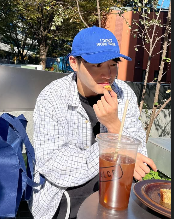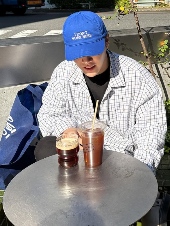 모자는 블루 볼캡을 착용하여 전체 룩에 스트리트적인 요소를 더했어요. 블루 컬러는 룩에 상큼한 포인트를 주며, 볼캡은 캐주얼하면서도 활동적인 느낌을 더해줍니다.