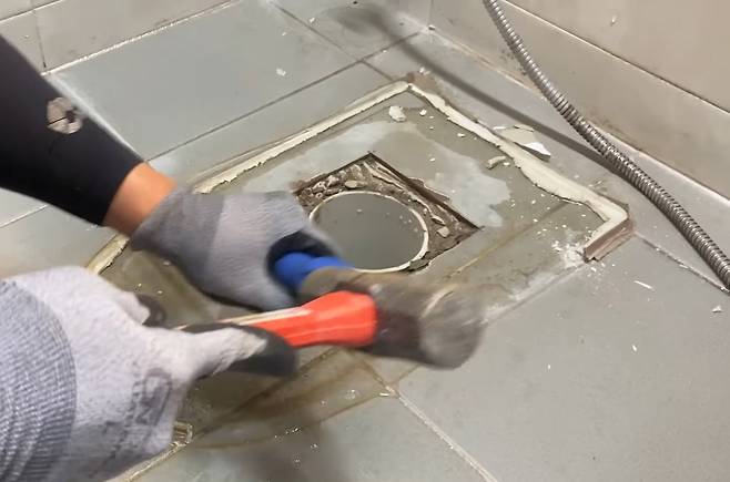 탈거한 변기는 현관에 두고 먼저 기존 변기를 탈거해야 하겠죠. 먼저 백시멘트부터 제거합니다. 망치랑