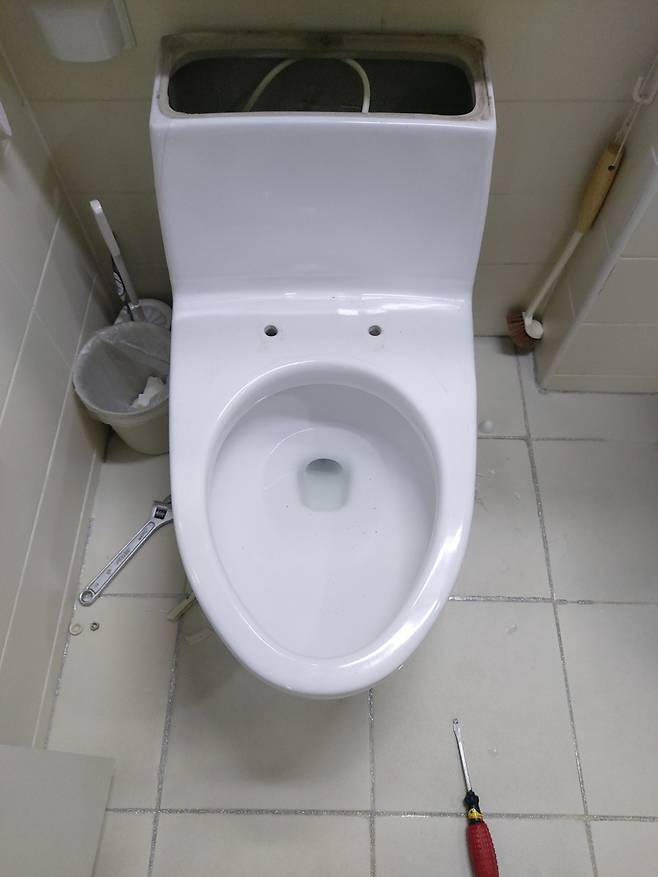 도착해보니 이미 변기는 탈거해 놨더라고요. 물이 흐르기에 짧은 거리라도 움직이기가 좀 그래서 지하에 있는