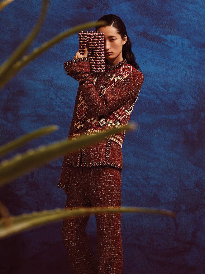 엠브로이더리 실크 튈 소재 베스트와 판타지 글리터드 트위드 소재 재킷, 팬츠, 멀티컬러 비즈 클러치백 모두 CHANEL