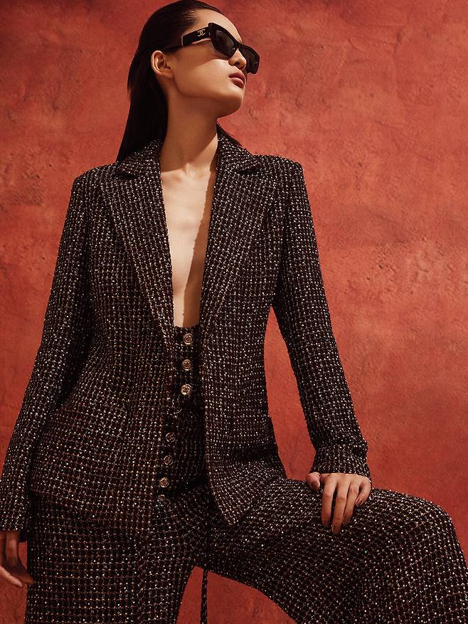 판타지 펄 트위드 소재 싱글 재킷과 팬츠, 로고 선글라스 모두 CHANEL