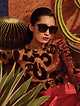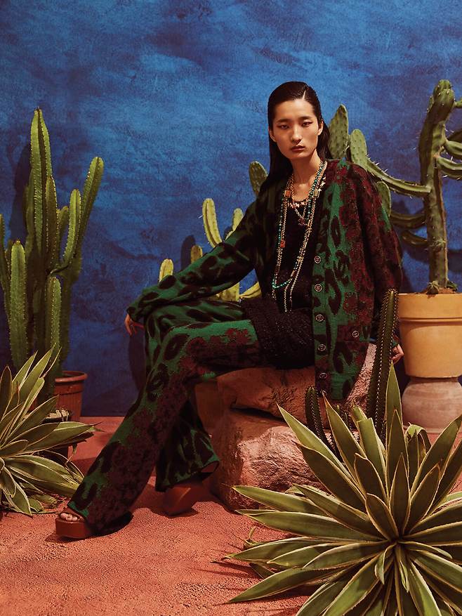 캐시미어와 모헤어 소재 레오퍼드 패턴 풀오버, 카프 스킨 소재 팬츠, 비즈 & 로고 장식 초커, 로고 선글라스 모두 CHANEL