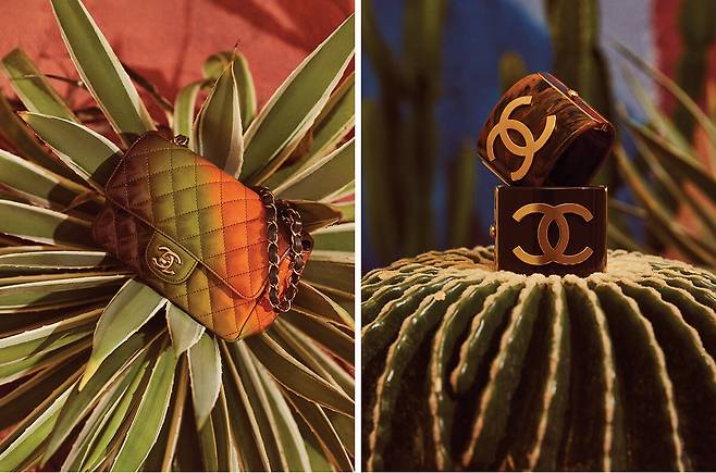 그러데이션 효과를 준 페이턴트 카프스킨 소재 미니 플랩 백과 레진 소재 로고 커프 브레이슬릿 모두 CHANEL