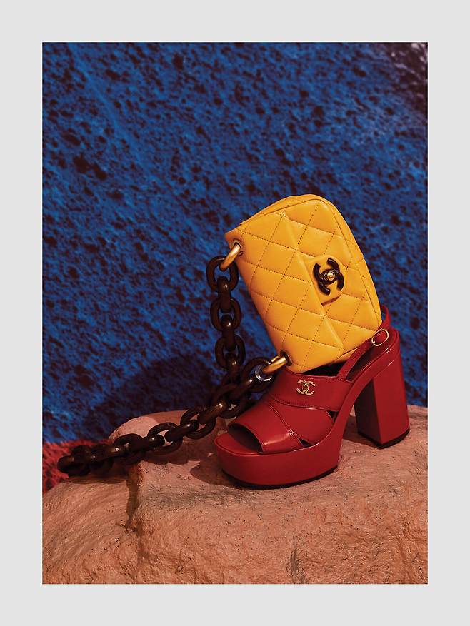 우드 스트랩 장식의 램스킨 소재 플랩백과 레드 컬러 램스킨 소재 플랫폼 샌들 모두 CHANEL