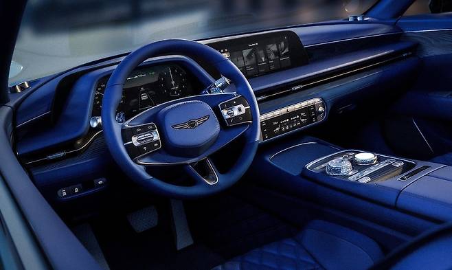 기존 G90 클러스터 좌우에 나뉘어 있던 날개 형상을 하나의 곡선으로 연결해 운전자 중심의 몰입감을 강화했으며, 스티어링 휠 하단에는 정밀한 패턴을 새긴 알루미늄 스포크를 추가해 시각적 균형감과 조작성을 모두 높였다.