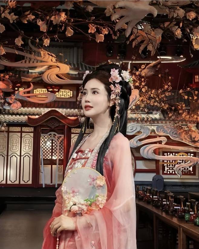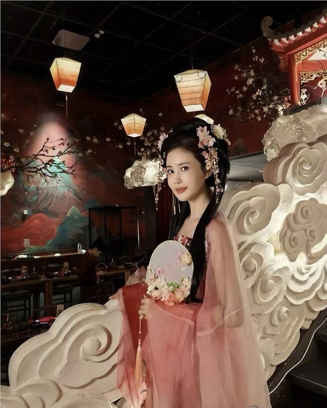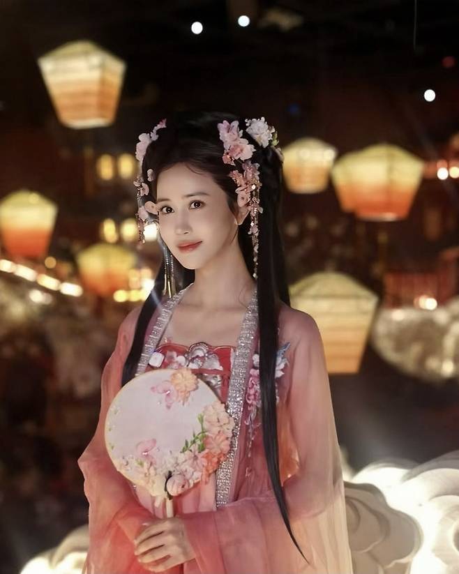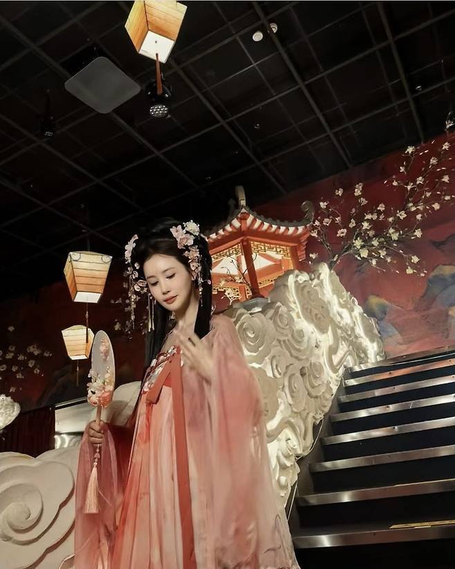 수묵화처럼 그러데이션 된 장밋빛 치마와 은은한 광택 디테일이 어우러진 당나라 전통 의상을 입고 등장해 마치 궁 안을 걷는 것처럼 신비롭고 고혹적인 분위기를 자아냈습니다.