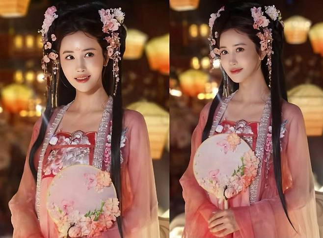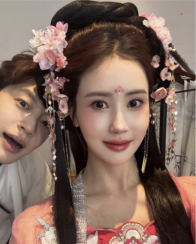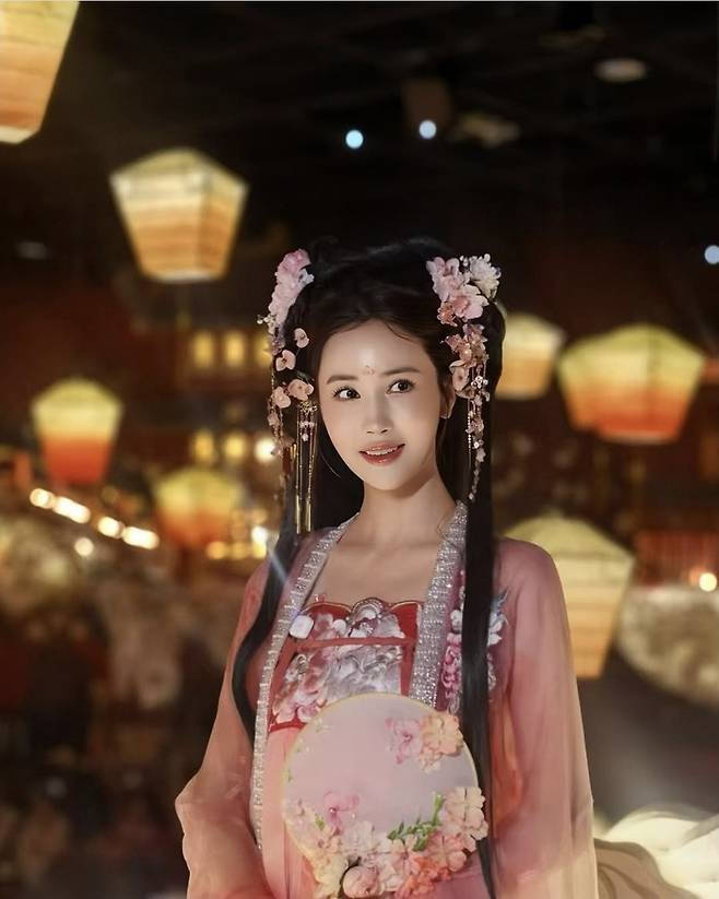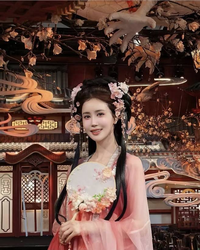 풍성한 헤어장식과 진주 드롭 장신구, 그리고 수놓은 듯한 꽃자수 부채까지 더해져 전통과 로맨틱이 공존하는 독보적인 스타일을 완성했습니다.