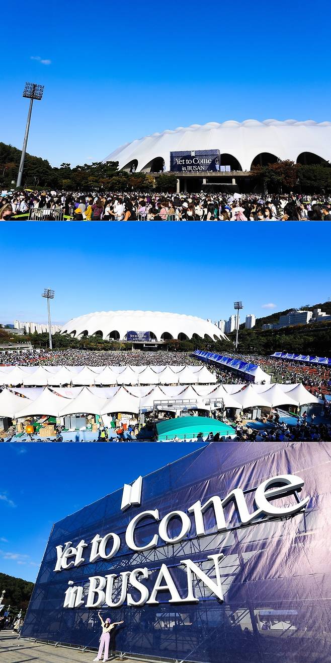 그룹 방탄소년단(BTS/RM, 진, 슈가, 제이홉, 지민, 뷔, 정국)은 10월 15일 오후 6시 부산광역시 연제구 부산아시아드주경기장에서 단독 콘서트 'BTS <Yet To Come> in BUSAN'(비티에스 <옛 투 컴> 인 부산)을 개최했다.
