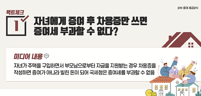 생활비 명목으로 계좌이체 하면 증여세 없이 현금 증여할 수 있다든지, 자녀에게 증여 후 차용증만 쓰면 증여세 부과할 수 없다든지 이런 내용을 한 번쯤 들어봤을 것입니다. 하지만 이 내용은 틀린 내용입니다. 세금 상식을 잘못 알고 있으면 그만큼 손해 볼 수밖에 없습니다. 특히, 증여세는 실생활과 밀접하기 때문에 제대로 알고 있어야 합니다.