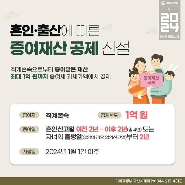 2024년 1월 1일부터 시행되고 있는 혼인을 지원하기 위한 새로운 세법 규정에 따르면, 혼인신고일 전후 2년 이내에 직계존속(부모, 조부모, 외조부모)으로부터 재산을 증여받는 경우, 최대 1억 원까지의 혼인 증여재산 공제를 받을 수 있습니다. 이는 기존의 5000만 원 증여재산 공제와 별도로 적용되어, 혼인 신랑•신부 각각 최대 1억 5000만 원까지 증여세 없이 재산을 증여받을 수 있는 길을 열었습니다. 따라서, 결혼을 앞둔 커플은 각각의 부모로부터 총 3억 원까지 증여세 부담 없이 받을 수 있게 되었습니다. 이러한 혜택은 초혼이든 재혼이든 관계없이 적용되며, 2024년 1월 1일 이전에 결혼한 이들도 혜택을 받을 수 있습니다.