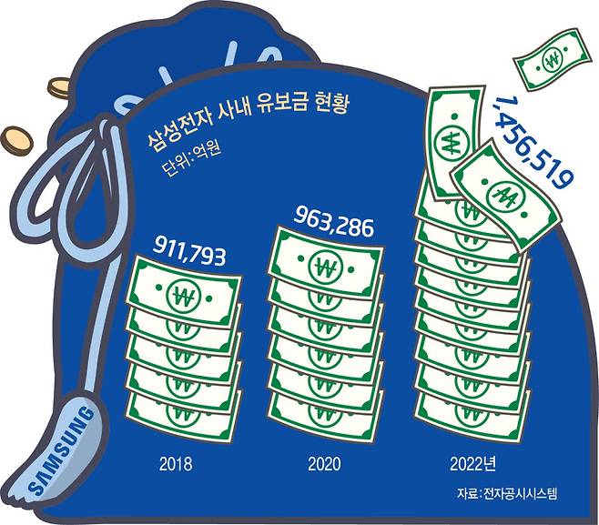 삼성전자가 공시한 감사보고서에 따르면 지난해 말 연결기준 미처분 이익잉여금(사내 유보금)은 145조6519억원으로 나타났다. 2021년(122조2506억원) 대비 18.8% 늘어나며 역대 최대치를 기록했다.