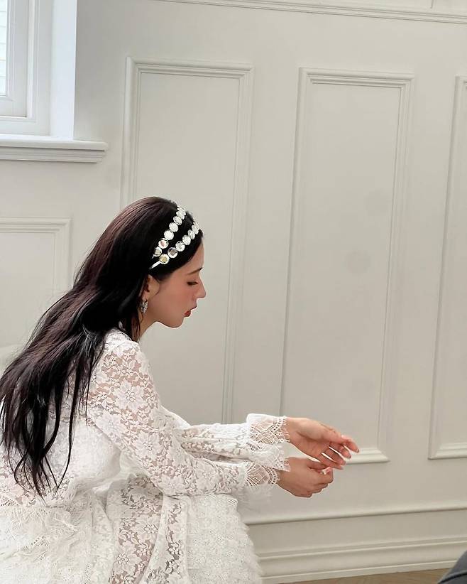 미연은 핫핑크 컬러의 볼륨감 있는 튤 드레스를 선택해 한층 화려하고 로맨틱한 분위기를 완성했다. 오프숄더 스타일로 연출된 드레스는 어깨 라인을 자연스럽게 드러내며 여성스러운 실루엣을 극대화했다. 가벼운 소재감의 튤이 겹겹이 쌓여 풍성한 볼륨을 만들어내면서도 부드럽고 사랑스러운 느낌을 더했다.