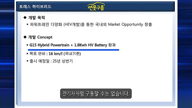최근 공개된 자료에 따르면 KGM은 1.8 kWh 배터리를 탑재한 풀 하이브리드 시스템을 개발 중이다. 배터리 용량이 작아 순수 전기차 구동은 어렵지만, 경쟁력 있는 연비를 목표로 하고 있다. 목표 연비는 16km/L로 투싼, 싼타페 하이브리드와 대등한 수준이다.