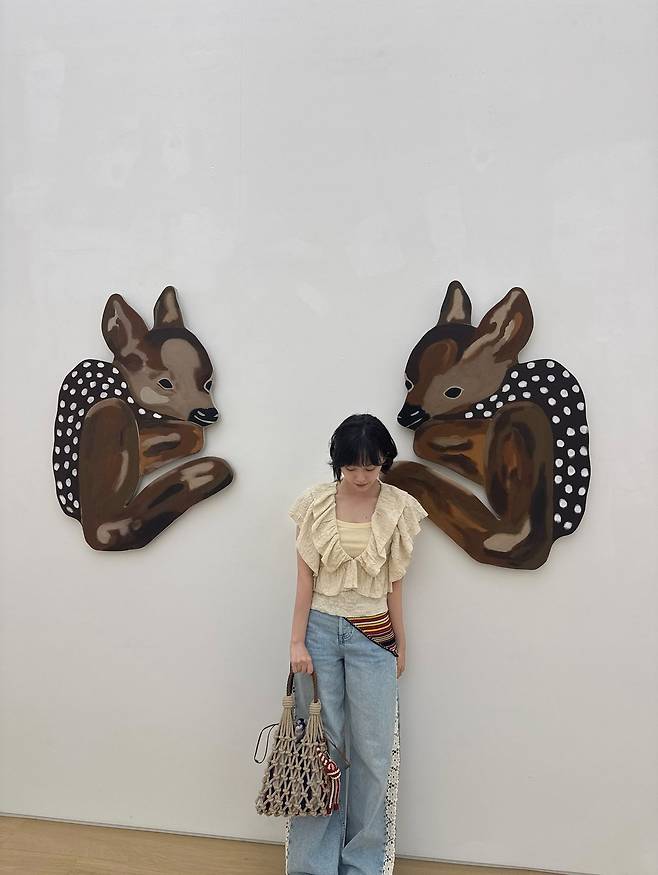 소품 활용 또한 빼놓을 수 없다. 매듭 짜임이 돋보이는 라탄백은 전시회 공간의 내추럴한 분위기와 어우러지며 아티스틱한 감각을 배가시켰다. 자연 소재의 질감이 더운 계절에 청량함을 전해주고, 전체적인 스타일에 한층 자유로운 무드를 불어넣는다. 댓글 창에서는 “작품과 하나가 된 듯하다”, “자체가 아트 전시다”라는 반응이 이어졌다.