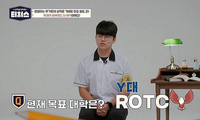 12일(일) 방송된 '성적을 부탁해 : 티처스'(이하 '티처스')에는 직업군인 아버지를 본받아 'Y대 ROTC'를 목표로 하고 있는 고1 이현서 학생이 도전학생으로 등장했다. 이현서 학생은 연세대에 가고 싶어 했다.