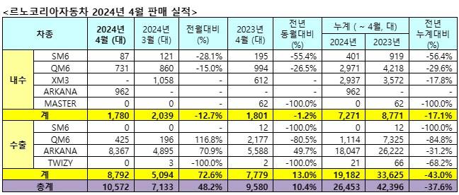 르노코리아는 지난 4월 내수 1,780대, 수출 8,792대로 총 10,572대의 판매 실적을 거두었다.