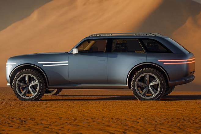 특히 긴 후드와 세련된 캐빈, 가파른 C-필러는 기존 SUV에서 볼 수 없는 독특한 실루엣을 완성했으며, 위아래로 나뉘어 열리는 후면부의 분할 개폐식(split-opening) 테일게이트는 제네시스의 시그니처 투라인 헤드램프와 조화를 이루어 실용성과 디자인을 동시에 만족시켰다.