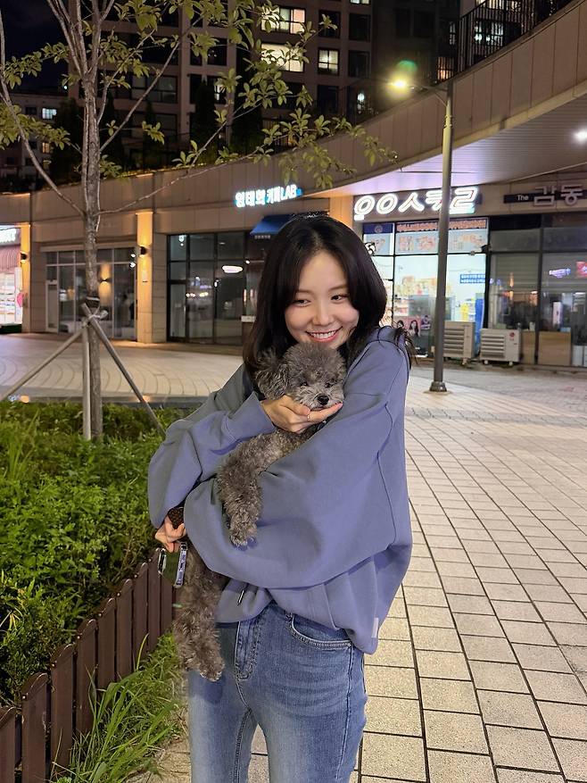 특히 품에 안은 강아지와의 장면은 이 룩의 매력을 극대화해요.