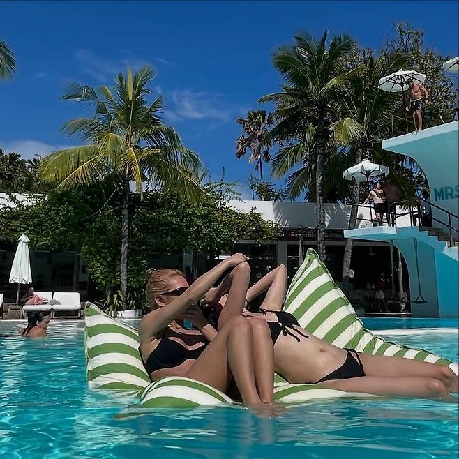 해변에서는 물론이고, 전망이 탁 트인 루프탑 공간에서도 그녀의 스타일링 감각은 빛을 발했다. 비키니 위에 컬러풀한 사롱을 묶어 감각적인 레이어드룩을 연출한 것. 네온 컬러가 가미된 사롱은 바닷가의 푸른 배경과 조화를 이루며 휴양지 특유의 활기찬 분위기를 한층 강조했다.
