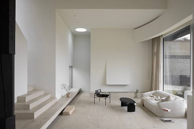 지난 집처럼 거실과 주방은 스킵 플로어로 공간을 구분했어요. 또한 안방은 반층 아래로 내려가 집에서도 외부에서도 조금은 가려진 위치에 디자인했고, 2층엔 작은 거실과 화장실이 딸린 손님방 겸 때에 따른 우리의 안방으로 설계하게 되었어요.