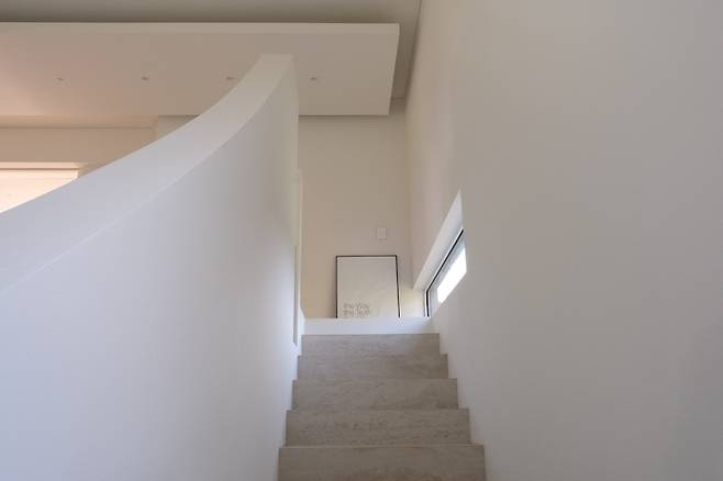 2층으로 향하는 계단은 높은 벽으로 통로가 되었어요. 처음엔 답답한 느낌이 들어 거실을 늘 바라볼 수 있게 벽을 낮춰 시공해 달라고 요청했어요. 그런데 양평 혜담헌은 대부분 오픈된 공간이 주를 이루고 있으니 새로운 곳을 향하는 통로 느낌이 들 수 있게, 이 곳은 닫힌 형태로 두는 것이 어떻겠냐는 제안을 주시더라구요.