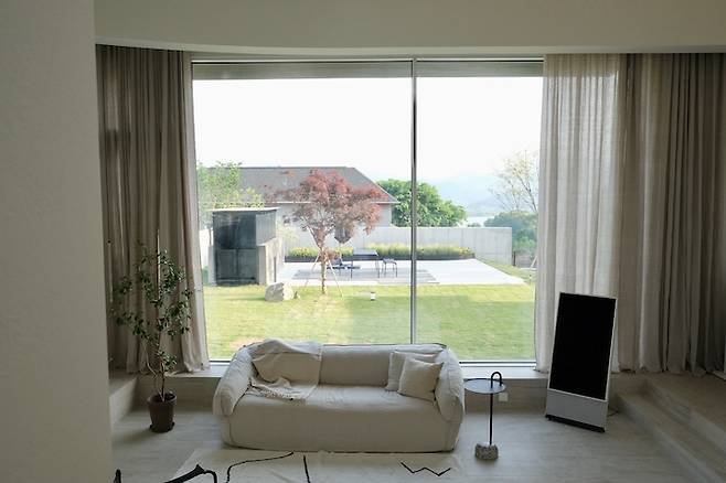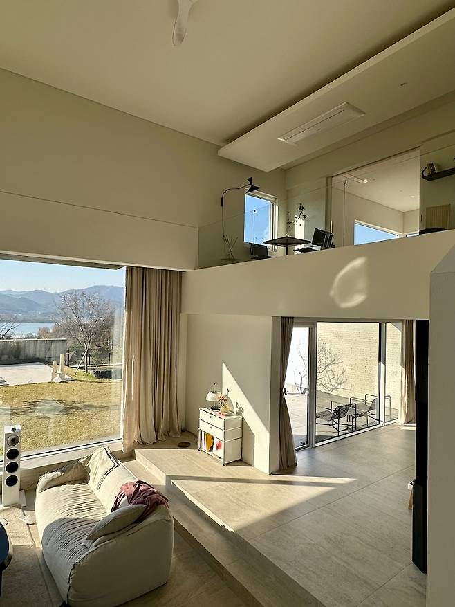 아일랜드 앞에 서서 바라보는 거실과 마당이에요. 요리하다가 고개를 들면 가끔 멍 때리게 되는 후련한 광경과 아름다운 남한강의 윤슬이 펼쳐지고 있어요.