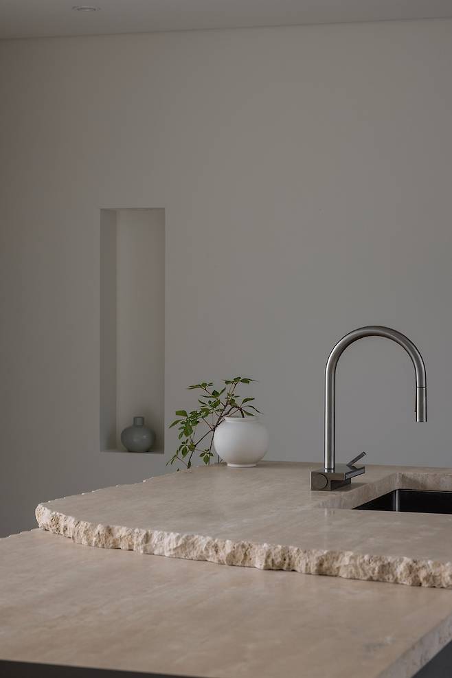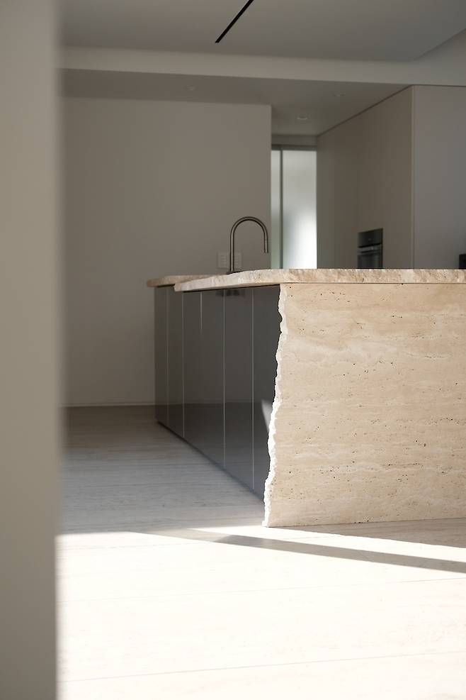 사실 저는 아일랜드 상판을 트라버틴 원석 그대로 사용하는 것에 대한 이질감이 있었어요. 하지만 첫 집에서 사용했던 저비용 우드 필름과 인조 대리석 아일랜드가 남편에겐 두고두고 후회되는 포인트였나 봐요.