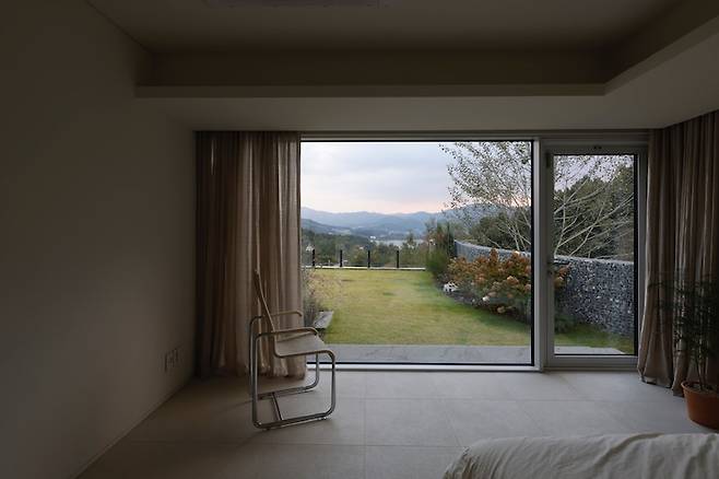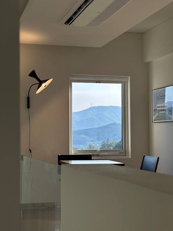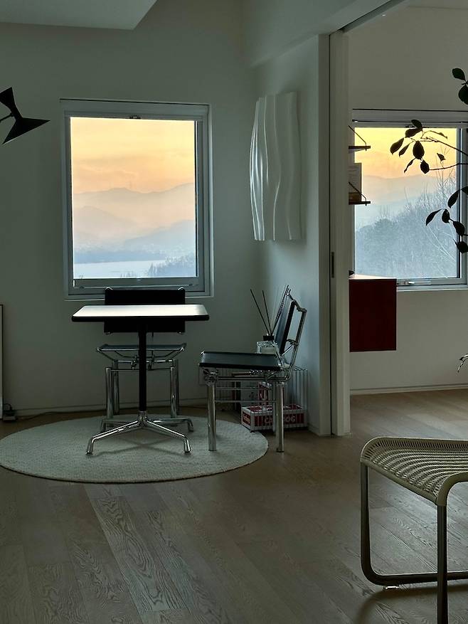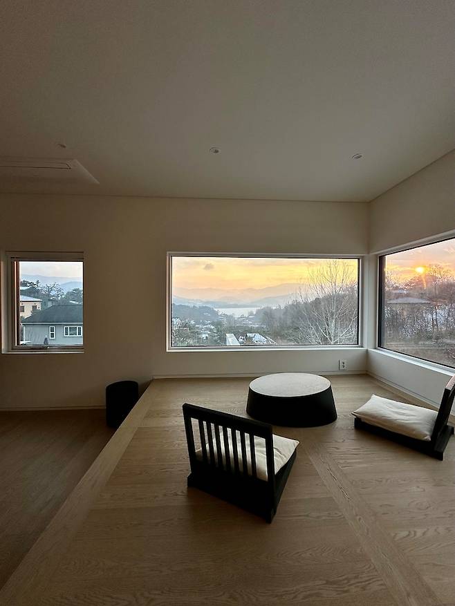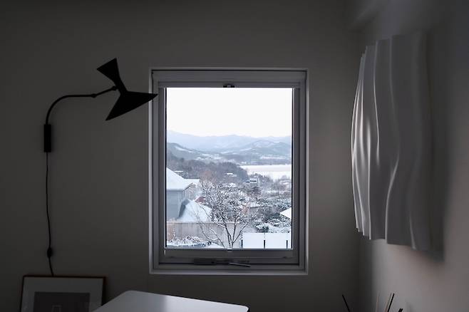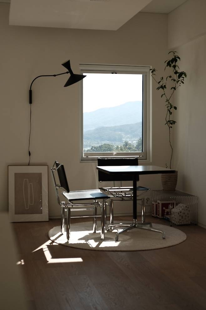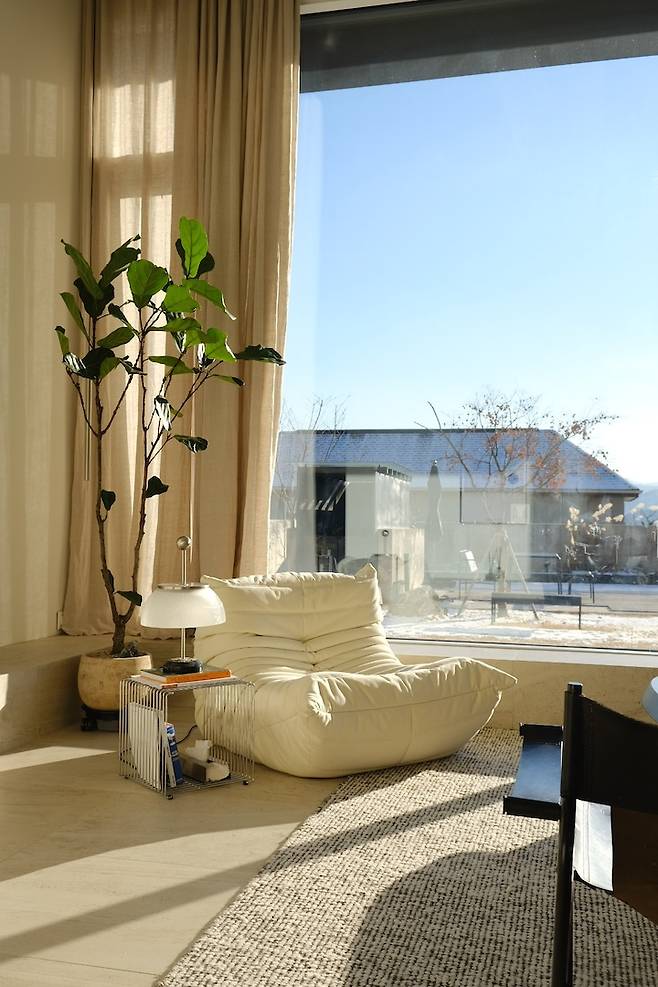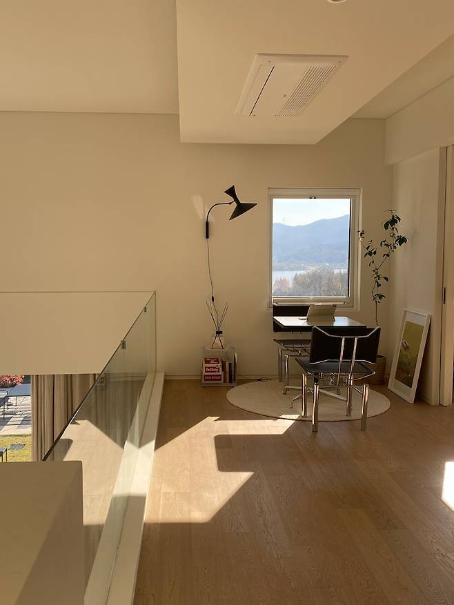 2층 거실에는 액자같은 작은 창 앞으로 아담한 사각 테이블과 반듯한 의자만 놓여있어요. 2층에서 바라보는 창 밖 풍경은 정말 환상적이에요.