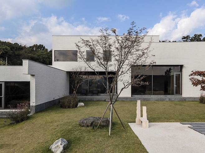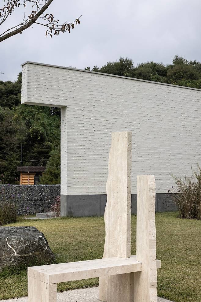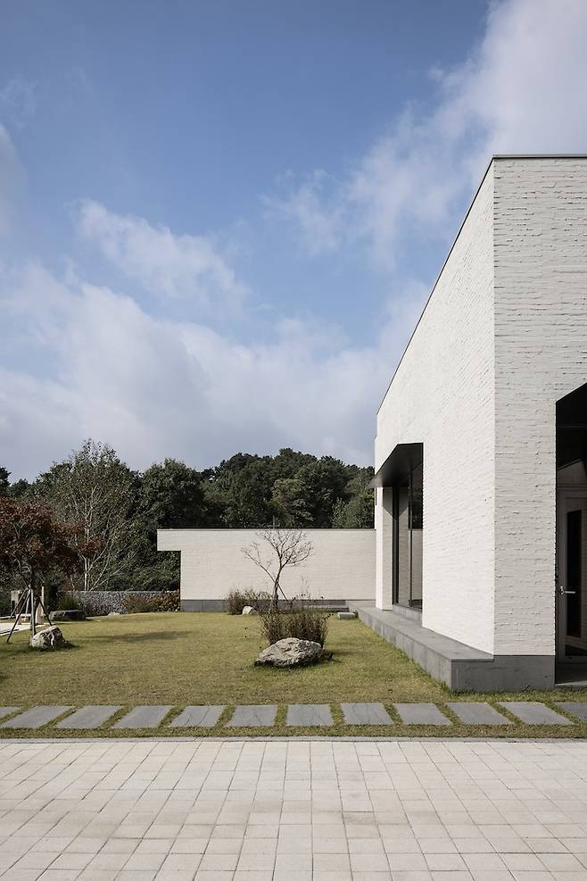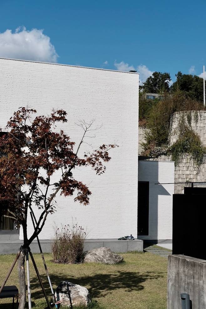 밝은 아이보리의 롱브릭으로 집 전체를 감싸고, 타일 사이사이는 거친 느낌이 드는 떡메지로 시공해 건물 전체가 하나의 덩어리로 보여질 수 있도록 했어요.