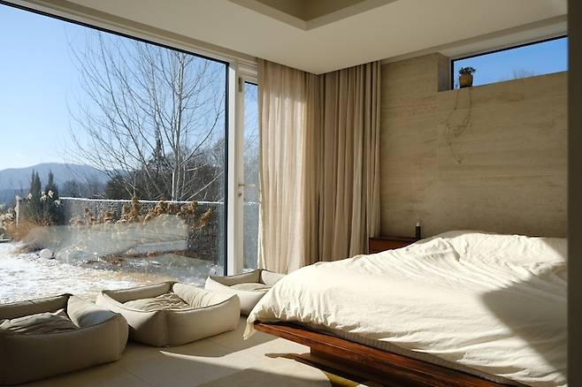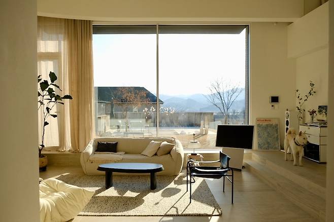 정남향으로 큰 창을 열어두어서 채광은 1년 365일 정말 정말 좋아요. 앞 건물들에 가려져 그늘이 질까 염려하며 설계했던 도심주택과는 달리 집 앞에는 작은 가림도 없어서 아무 고민없이 한쪽 벽 전체를 완전히 창으로 마감했어요.