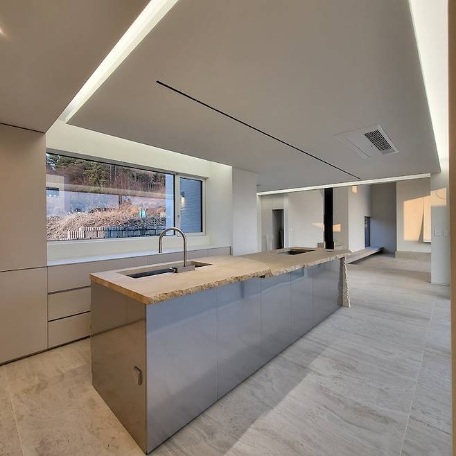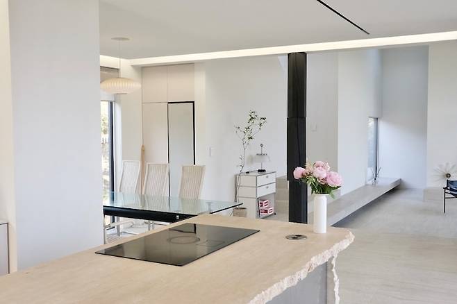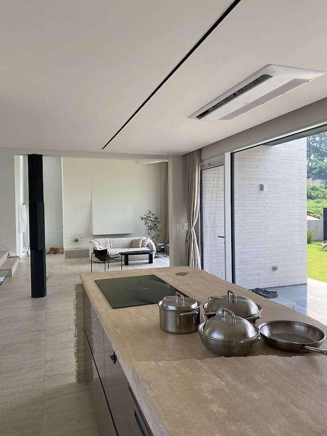 아무래도 저는 공간이 분리된 형태를 선호하는 것 같아요. 하지만 이번에는 거실에서도 주방이 완전히 보이게, 식탁에 앉아서도 거실과 마당이 다 보이게 열린 형태로 설계했어요.