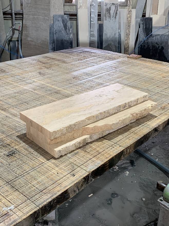 남은 트라버틴으로는 2층으로 올라가는 계단, 마당의 조형물, 현관의 벤치로 알뜰히 제작했어요. 벤치는 거실로 옮겨 멋진 오브제 및 선반으로 사용하고 있답니다.