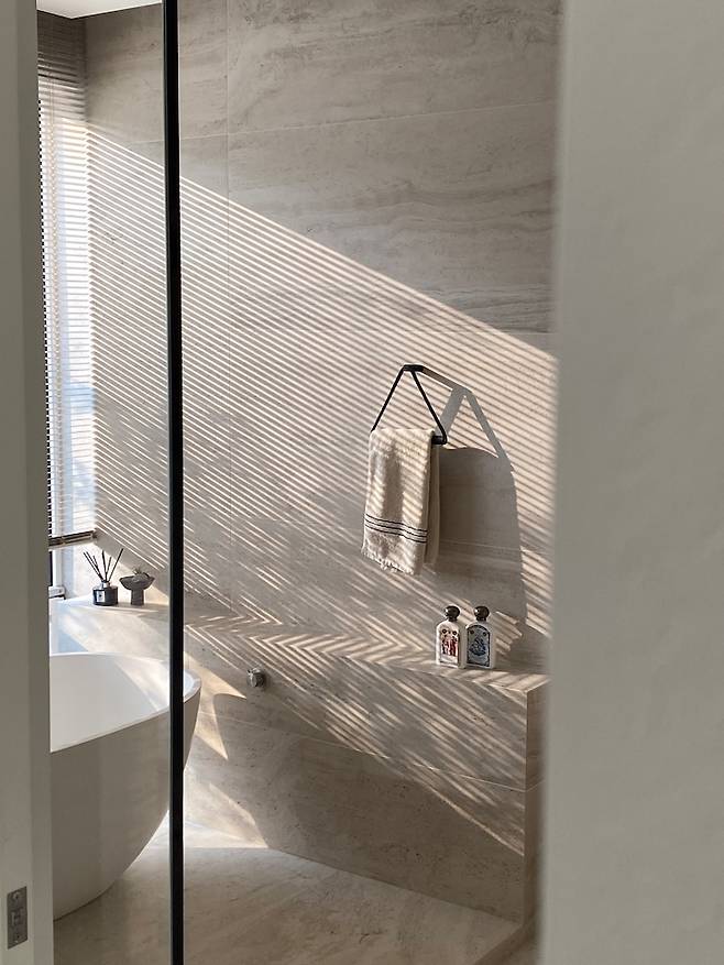 안방 욕실에는 프리 스탠딩 욕조를 들였어요. 조적 욕조만 있었던 지난 집에서는 욕조를 사용할 때 마다 금방 물이 식어버리거나 몸을 누이기 불편했던 경험을 자주 했었어요.