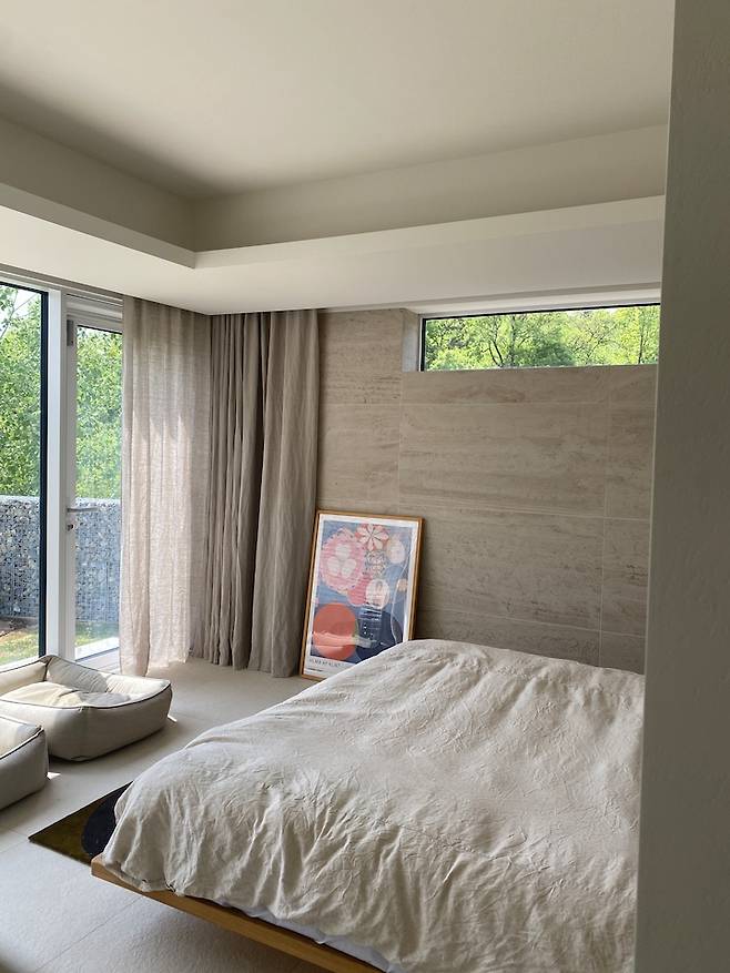 실제로 이 공간에서 많은 생활을 하지는 않기 때문에 빛으로 인한 불편함은 전혀 없어요. 대신 공간이 완성되지 않은 듯한 느낌이 들어서 단조로운 커튼이라도 살짝 내리는 게 어떨지 여쭤봤었는데 너무나 단호하셨어요.