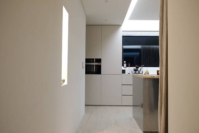 입구 복도 위에는 동그란 천창이 뚫려 있어요. 불이 켜지지 않을 땐 다소 어두운 입구 쪽이라 천창의 자연광을 통해 밝은 조도를 유지할 수 있도록 세심하게 만들어뒀답니다.