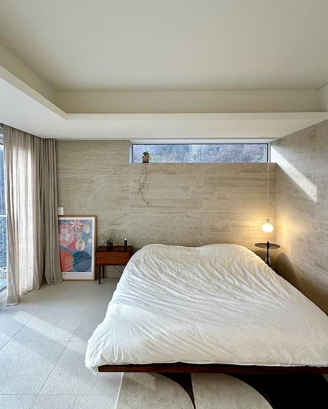 침대는 이미 10년 가까이 사용하고 있는 프레임이에요. 색상이 이 집과 어울리지 않아서 직접 선택한 짙은 컬러의 우드 스테인을 발랐고, 트라버틴의 전체적인 톤과 협탁의 컬러에 잘 어울리도록 완성되어서 만족하는 중이에요.