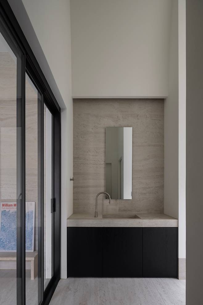 집에 들어오면 바로 손을 씻을 수 있도록, 집을 나서기 전 마지막으로 얼굴을 확인할 수 있도록 현관 바로 앞의 화장실과 분리해서 시공한 입구 세면대예요.